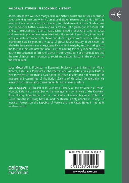Recent decades have seen many economic history books and articles published about working men and women, small and big entrepreneurs, guilds and state manufactures, farmers and journeymen, and children and citizens. Studies have been conducted both at a macro and a micro level, at a global and at a local scale and with regional and national approaches aimed at analysing cultural, social and economic phenomena associated with the world of work. Yet, there is still new ground to be covered. This book aims to fill a gap in early modern history by presenting new insights in the study of global labour history. It considers the whole Italian peninsula as one geographical unit of analysis, encompassing all of the features that characterize labour cultures during the early modern period. It details the evolution of forms of labour in both agriculture and manufacture and the role of labour as an economic, social and cultural factor in the evolution of the Italian area.