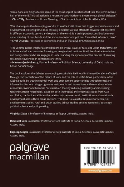 The book explores the debates surrounding sustainable livelihood in the neoliberal era effected through transformation of the nature of work and the role of institutions, particularly in the Global South. By creating gainful work and employment opportunities through formal and informal institutions using progressive instruments and innovations within rural and urban economies, livelihood becomes 'sustainable', thereby reducing inequality and increasing resilience among households.