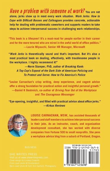 For over forty years, Louise Carnachan has worked as a trainer and organization development consultant helping thousands of leaders and staff members achieve interpersonal success with challenging work relationships. She has worked in manufacturing, education, healthcare, and scientific organizations. As a consultant, her clients have included Head Start programs, PNW Fertility, Bastyr University and Clinic, VA Puget Sound Health Care, a variety of Washington State departments, Boeing, McDonalds Corporation, Starbucks, University of Washington Medical Center, and the Port of Seattle. She is former adjunct faculty at Seattle Pacific University and Seattle Community College and taught a course for the University of Washington’s MBA program. Currently, she is a semi-retired coach for leadership clients and pens a workplace advice blog on her website (with debatable input from her feline office mates). She lives in a suburb of Portland, Oregon, and enjoys Powell’s Books, coastal beach towns, and her local library, where she can most often be found browsing the mystery section.