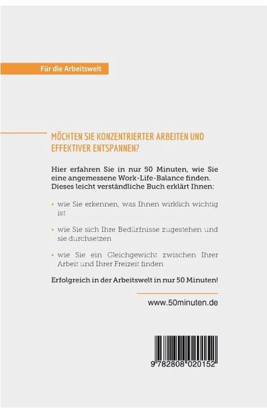 Alles über die Work-Life-Balance in nur 50 Minuten Sie nehmen häufig Arbeit mit nach Hause und schalten auch nach Feierabend nicht wirklich ab? Haben Sie das Gefühl, dass Ihre Freizeit zu kurz kommt? Eine klare Grenze zwischen Berufs- und Privatleben hilft, ein gutes Gleichgewicht zwischen den beiden zu finden und sich bei der Arbeit besser zu konzentrieren und gleichzeitig in der Freizeit wirklich zu entspannen. Dazu sollte man sich seiner Bedürfnisse und Grenzen bewusst sein und sich behaupten. Mit den hier vorgestellten Tipps und praktischen Herangehensweise finden Sie so eine motivierende Work-Life-Balance! Nach 50 Minuten können Sie: ¿ Ihre Hauptantriebskraft finden ¿ Ihre Bedürfnisse und Grenzen erkennen ¿ sich so organisieren, dass Sie Ihre Work-Life-Balance einhalten Starten Sie mit diesen praktischen Tipps voll durch! Über 50MINUTEN Für die Arbeitswelt Was bringt Sie im Job weiter? Die Serie Für die Arbeitswelt der Reihe 50Minuten ist für alle geeignet, die sich ¿ egal auf welchem Abschnitt ihrer Karriere ¿ neue persönliche und berufliche Kompetenzen aneignen, ihr Potenzial optimal ausschöpfen oder einfach ihre Work-Life-Balance hinterfragen wollen. Unsere kompakten Titel enthalten nicht nur eine von Experten erstellte Übersicht über die relevante Theorie, sondern auch konkrete Anleitungen, die von zahlreichen Beispielen unterstützt werden. Die einfache und leicht verständliche Formulierung der komplexen Sachverhalte ist somit der ideale Ausgangspunkt für Angestellte, Arbeitgeber und Arbeitssuchende.