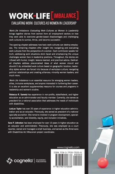 Work-Life Imbalance: Evaluating Work Cultures as Women in Leadership brings together stories from women from all employment sectors on how they were able to overcome gender-based disadvantages and challenging work cultures to survive, thrive, and become successful. The opening chapter addresses how toxic work cultures can destroy employees. The remaining chapters offer insight into navigating and evaluating work cultures from the perspective of a woman. Each contributor speaks her truth, addressing work situations she's faced and emphasizing the unique challenges women face in leadership positions. Throughout, the stories are infused with humor, insight, lessons learned, and practical advice. Dedicated chapters address preconceived ideas of what women should and shouldn't do; embedded work culture based on geographic location; leadership styles women are forced into because of workplace culture; navigating political relationships and creating alliances; minority women leaders; and much more. Work-Life Imbalance is an essential resource for emerging women leaders, allies, inclusive workplaces, and anyone interested in furthering their career. It is also an excellent supplementary resource for courses and programs in leadership and women's studies.