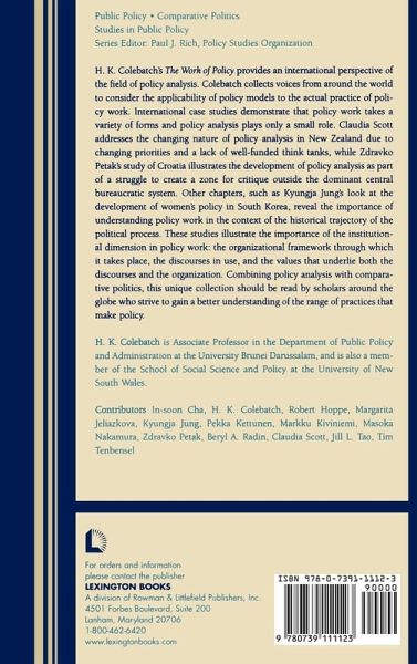 H. K. Colebatch's The Work of Policy provides an international perspective on the field of policy analysis. Colebatch collects voices from around the world to consider the applicability of policy models to the actual practice of policy work. International case studies demonstrate that policy work takes a variety of forms, and policy analysis plays only a small role.