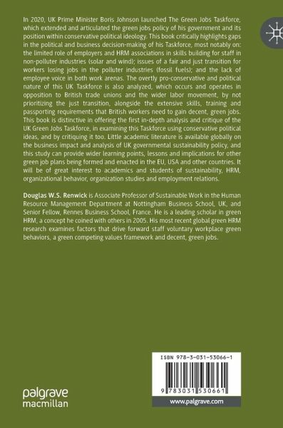 In 2020, UK Prime Minister Boris Johnson launched The Green Jobs Taskforce, which extended and articulated the green jobs policy of his government and its position within conservative political ideology. This book critically highlights gaps in the political and business decision-making of his Taskforce, most notably on: the limited role of employers and HRM associations in skills building for staff in non-polluter industries (solar and wind); issues of a fair and just transition for workers losing jobs in the polluter industries (fossil fuels); and the lack of employee voice in both work arenas. The overtly pro-conservative and political nature of this UK Taskforce is also analyzed, which occurs and operates in opposition to British trade unions and the wider labor movement, by not prioritizing the just transition, alongside the extensive skills, training and passporting requirements that British workers need to gain decent, green jobs.