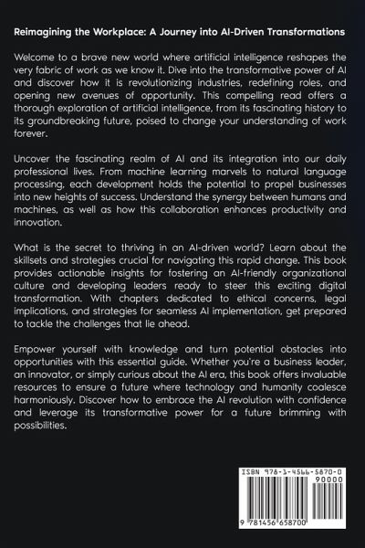 Reimagining the Workplace: A Journey into AI-Driven Transformations Welcome to a brave new world where artificial intelligence reshapes the very fabric of work as we know it. Dive into the transformative power of AI and discover how it is revolutionizing industries, redefining roles, and opening new avenues of opportunity. This compelling read offers a thorough exploration of artificial intelligence, from its fascinating history to its groundbreaking future, poised to change your understanding of work forever. Uncover the fascinating realm of AI and its integration into our daily professional lives. From machine learning marvels to natural language processing, each development holds the potential to propel businesses into new heights of success. Understand the synergy between humans and machines, as well as how this collaboration enhances productivity and innovation. What is the secret to thriving in an AI-driven world? Learn about the skillsets and strategies crucial for navigating this rapid change. This book provides actionable insights for fostering an AI-friendly organizational culture and developing leaders ready to steer this exciting digital transformation. With chapters dedicated to ethical concerns, legal implications, and strategies for seamless AI implementation, get prepared to tackle the challenges that lie ahead. Empower yourself with knowledge and turn potential obstacles into opportunities with this essential guide. Whether you're a business leader, an innovator, or simply curious about the AI era, this book offers invaluable resources to ensure a future where technology and humanity coalesce harmoniously. Discover how to embrace the AI revolution with confidence and leverage its transformative power for a future brimming with possibilities.