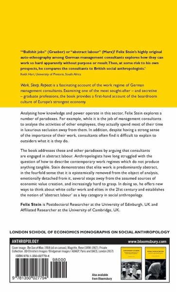 Work, Sleep, Repeat is a fascinating account of the work regime of German management consultants. Examining one of the most sought-after - and secretive - graduate professions, the book provides a first-hand account of the boardroom culture of Europe's strongest economy. Analyzing how knowledge and power operate in this sector, Felix Stein explores a number of paradoxes. For example, while it is the job of management consultants to analyse the activities of other employees, they actually spend most of their time in luxurious seclusion away from them. In addition, despite having a strong sense of the importance of their work, consultants often find it difficult to explain to outsiders what it is they do. The book addresses these and other paradoxes by arguing that consultants are engaged in abstract labour. Anthropologists have long struggled with the question of how to describe contemporary work regimes which do not produce anything tangible. Stein demonstrates that elite work is predominantly abstract, in the fourfold sense that it is epistemically removed from the object of analysis, emotionally detached from it, several steps away from the assumed sources of economic value creation, and increasingly hard to grasp. In doing so, he offers new ways to think about white collar work and elites in the 21st century and establishes the notion of 'abstract labour' as a key category in social anthropology.