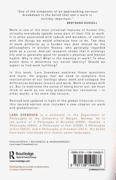 In this book, Lars Svendsen explores these questions and more. He argues that we need to complete this reorientation of our feelings about work and collapse the differences between leisure and work. Work is always with us. But to overcome the sense of being burnt out, we must think of work as not only productive but recreative - in other words, a lot more like leisure.