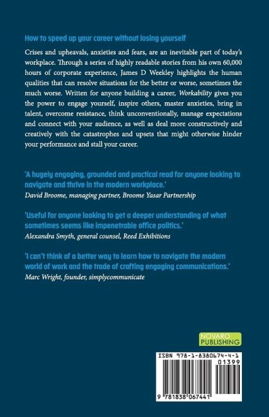 It's the human challenges that will define your career. In this book, a top workplace communicator gives a real-life account of the personal skills and behaviours that really count in global organizations. Crises and upheavals, anxieties and fears, are an inevitable part of today's workplace. Through a series of highly readable stories from his own 60,000 hours of corporate experience, James Weekley highlights the human qualities that can resolve situations for the better or worse, sometimes the much worse. Your workability depends on how you communicate and behave, he says: what you do matters less than how you do it. Drawing on his knowledge of psychology, language, behaviour and communication, his book equips you with unexpected ways to think about how to manage the human challenges you will encounter and how you can speed up your career without losing yourself. In reality, he says, most of us will find ourselves following more than we lead. We will face a crisis every two to three years. We will suffer from anxieties. We will lose ourselves in gobbledygook. We will have to influence without authority. We will be subject to bad behaviours and toxic cultures. Written for anyone building a career, Workability gives you the power to engage yourself, inspire others, master anxieties, bring in talent, overcome resistance, think unconventionally, manage expectations and connect with your audience, as well as deal more constructively and creatively with the catastrophes and upsets that might otherwise hinder your performance and stall your career.