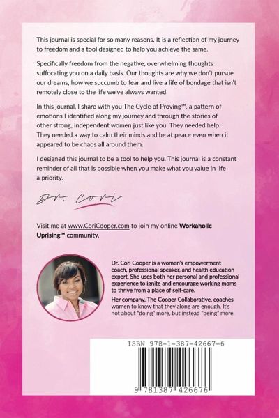 Product Description: The Workaholic Uprising Journal is a tool designed to help working moms achieve freedom from overwhelming thoughts that suffocate women daily underneath a long list of to-dos. Thoughts keep women from pursuing their dreams, allow us to succumb to fear and live a life of bondage that isn't remotely close to the life we've always wanted. Within this journal, you will find The Cycle of Proving, a pattern of emotions I identified along my journey to freedom and through the stories of other strong, working moms. This journal is a constant reminder of all that is possible when you make what you value in life a priority. About The Author: Dr. Cori Cooper is a women's empowerment coach, professional speaker, and health education expert. She uses both her personal and professional experience to ignite and encourage working moms to thrive from a place of self-care.