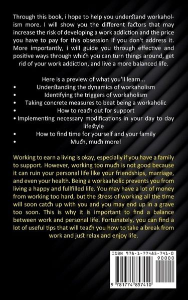 Through this book, i hope to help you understand workaholism more. I will show you the different factors that may increase the risk of developing a work addiction and the price you have to pay for this obsession if you don't address it. More importantly, i will guide you through effective and positive ways through which you can turn things around, get rid of your work addiction, and live a more balanced life. Here is a preview of what you'll learn...Understanding the dynamics of workaholism Identifying the triggers of workaholism Taking concrete measures to beat being a workaholic How to reach out for support Implementing necessary modifications in your day to day lifestyle How to find time for yourself and your family Much, much more! Working to earn a living is okay, especially if you have a family to support. However, working too much is not good because it can ruin your personal life like your friendships, marriage, and even your health. Being a workaaholic prevents you from living a happy and fullfilled life. You may have a lot of money from working too hard, but the stress of working all the time will soon catch up with you and you may end up in a grave too soon. This is why it is important to find a balance between work and personal life. Fortunately, you can find a lot of useful tips that will teach you how to take a break from work and just relax and enjoy life.