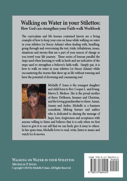 WALKING ON WATER IN YOUR STILETTOS: HOW GOD CAN CHANGE YOUR FAITH-WALK WORKBOOK Now that you're at the door ready to enter your season of CHANGE, continue your journey by answering the question, 'In what way is CHANGE knocking on my door demanding entrance,' to take that first critical step into the CHANGE that's waiting on you! The curriculum and life lessons contained herein are living examples of how to keep your eyes on Jesus while walking on water in your stilettos (or Stacey Adams) when dealing with, handling, going through and/or overcoming the test, trials, tribulations, issues, situations, heart aches, heartbreaks and storms that are a part of your SEASON OF CHANGE as you travel your life journey. These series of lessons parallel the steps used when learning to walk in heels and are indicative of the steps used to strengthen a believer's faith-walk. Simply put, it is how to walk on water in your stilettos (or Stacey Adams) while encountering the storms that show up in life without warning and have the potential of drowning and consuming you or birthing YOU anew! So, I challenge you to put on your stilettos (or Stacey Adams) because we've got work to do! The best utilization of this workbook is to be used in conjunction with the book, "Walking on Water in my Stilettos" and the journal. Take the time to complete the lesson because they are designed to make you think, and to be honest and transparent with YOURSELF. You will learn while completing these lessons that the most important person you will encounter, learn to love, unconditionally accept, respect and be excited to meet while experiencing the lessons is YOU!Michelle P. Jones is the youngest daughter and child born to Rev. Cooper L. and Evang. Marva E. Bledsoe. She is the proud mother of three: DeShawn, Jeramey and Christian, and the loving grandmother to three: Amari, Amani and Ayden. ¿Michelle is dedicated to sharing the message of hope, love, forgiveness and acceptance with anyone willing to listen and believes that it is only when we first learn to give it to our self that we can freely give it away to others. In her spare time, Michelle loves to read, write, listen to music and watch Sci-fi movies.