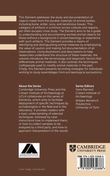 This Element focuses on studying and documenting durable animal body artifacts like bone, antler, ivory, and keratinous tissues. It emphasizes caution and documentation, using illustrations and descriptions to understand their structure. It introduces terminology, diagnostic factors, and techniques used by craftspeople to modify animal materials.