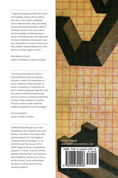The poems in Working Hypothesis celebrate curiosity. They revel in the discoveries of Natural Science as well as the hoaxes and scientific jokes that litter our history of knowing. These are the product of Charles Malone's rural upbringing and connection to the natural world, his family's passed-down bookishness, and his mother's work as a chemist. Poems like "Beneficial Insects" and "Papilio Ecclipses" look to the intersections of these ideas with our most intimate personal relationships. The poem "About the River" comes from Malone's work using poetry writing in the community to talk about the history of the Cuyahoga River. These pieces balance intellectual searching with domestic moments of childhood, marriage, and the making of a home. Amid his wonder for the natural world, Malone's poems also grow from doubt. We have painted butterfly's wings to claim a new species, imagined animals that burst from the seeds of plants, and written of man-eating trees in the jungle of Madagascar. We have lied to and amused ourselves. We have made mistakes. "Adecula Ridiculi" considers the metaphors offered by a typo that bred a fake history of a temple constructed to mock Hannibal's failed siege of Rome. "Jokes of Nature / Jokes of Knowledge" and "Truthfully" catalog a cabinet of curiosities in the history of Natural Science, and "The Man-Eating Tree of Madagascar" imagines that lie as something akin to the way an older sibling might mislead a younger one. The final section of the book, "Experiments & Tricks" draws from Robert J. Brown's 333 Science Tricks & Experiments. Brown's 1984 book offers up an abundance of ideas to bring science into the home. This infusion of metaphor and vocabulary invites us to consider the simple act of counting the seconds between lightning and thunder differently in "How Far the Storm?" This poem connects to the history of Malone's home town, Kent, Ohio, and the shootings on the campus in 1970. He writes, "We can count the seconds between / explosions. / We can feel them in our teeth. / Even as one voice says / a storm is coming, another says it isn't." Other experiments inspire "Mirror Tricks," "Smoke from the Fingertips," and "Ghost Light." In all, these poems encourage us all to follow our questions and our doubts. They invite us into overservation and to be childlike in embracing our curiosity.