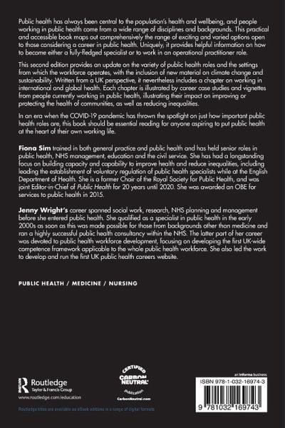 This second edition provides an update on the variety of public health roles and the settings from which the workforce operates, with the inclusion of new material on climate change and sustainability. Written from a UK perspective, it nevertheless includes a chapter on working in international and global health. Each chapter is illustrated by career case studies and vignettes from people currently working in public health, illustrating their impact on improving or protecting the health of communities, as well as reducing inequalities.