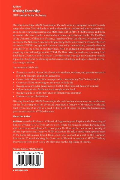 Working Knowledge: STEM Essentials for the 21st Century is designed to inspire a wide range of readers from high school and undergraduate students with an interest in Science, Technology, Engineering, and Mathematics (STEM) to STEM teachers and those who wish to become teachers. Written by renowned scientist and teacher Dr. Karl Hess of the University of Illinois at Urbana, a member of both the National Academy of Sciences and the National Academy of Engineering, the book presents a critical collection of timeless STEM concepts and connects them with contemporary research advances in addition to the needs of our daily lives. With an engaging and accessible style not requiring a formal background in STEM, Dr. Hess takes the reader on a journey from Euclidean Geometry and Cartesian Coordinates up through 21st Century scientific topics like the global positioning system, nanotechnology, and super-efficient alternative energy systems.