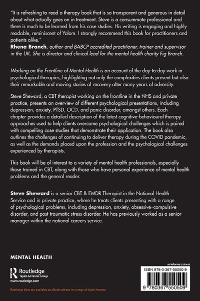 Steve Sheward, a CBT therapist working on the frontline in the NHS and private practice, presents an overview of different psychological presentations, including depression, anxiety, PTSD, OCD, and panic disorder, amongst others. Each chapter provides a detailed description of the latest cognitive-behavioural therapy approaches used to help clients overcome psychological challenges which is paired with compelling case studies that demonstrate their application. The book also outlines the challenges of continuing to deliver therapy during the COVID pandemic, as well as the demands placed upon the profession and the psychological challenges experienced by therapists.