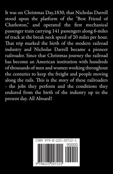 It was on Christmas Day,1830, that Nicholas Darrell stood upon the platform of the "Best Friend of Charleston," and operated the first mechanical passenger train carrying 141 passengers along 6-miles of track at the break neck speed of 20 miles per hour. That trip marked the birth of the modern railroad industry and Nicholas Darrell became a pioneer railroader. Since that Christmas journey the railroad has become an American institution with hundreds of thousands of men and women working throughout the centuries to keep the freight and people moving along the rails. This is the story of these railroaders - the jobs they perform and the conditions they endured from the birth of the industry up to the present day. All Aboard!