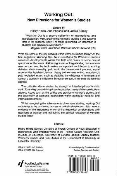 Working Out Jackie Stacey Ann Phoenix Hilary Hinds; The Politics and Practice of Women's Studies; Chapter 1 Feminist Politics after Thatcher Beatrix Campbell; Chapter 2 Pedagogical Praxis and Problems Maureen McNeil; Chapter 3 Whiteness - The Relevance of Politically Colouring the 'Non ' Helen (charles); Chapter 4 Men in Women's Studies Classrooms Deborah Philips Ella Westland; Commonalities and Differences; Chapter 5 Difference Power and Knowledge Felly Nkweto Simmonds; Chapter 6 Disabled Women and the Feminist Agenda Nasa Begum; Chapter 7 Desire and the Politics of Representation Tamsin Wilton; Chapter 8 Difference at Work Gill Dunne; International Feminisms; Chapter 9 Feminist Perspectives in Development Kabeer Naila; Chapter 10 Women's Rights and Human Rights in Muslim Countries Sardar-Ali Shaheen Mullally Siobhan; Chapter 11 women's Studies in Central and Eastern Europe Chris Corrin; Chapter 12 Does Equal Opportunity Legislation and Practice Serve the Women's Movement? A Case Study from Australian Higher Education Christine Wieneke; Theories and Methods; Chapter 13 Defending the Indefensible? Quantitative Methods and Feminist Research Liz Kelly Linda Regan Sheila Burton; Chapter 14 Epistemological Issues in Researching Lesbian History Liz Stanley; Chapter 15 Gender and the Labour Market Lisa Adkins Celia Lury; Chapter 16 Dialogic Theory and Wotnen's Writing Lynne Pearce;