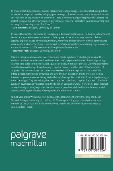 Working-through Collective Wounds discusses how collectives mourn and create symbols. It challenges ideas of the irrational and destructive crowd, and examines how complicated scenes of working-through traumas take place in the streets and squares of cities, in times of protest. Drawing on insights from the trauma theory of psychoanalyst Sándor Ferenczi and his idea of the 'confusion of tongues', the book engages the confusions between different registers of the social that entrap people in the scene of trauma and bind them in alienation and submission. Raluca Soreanu proposes a trauma theory and a theory of recognition that start from a psychoanalytic understanding of fragmented psyches and trace the social life of psychic fragments. The book builds on psychosocial vignettes from the Brazilian uprising of 2013. It will be of great interest to psychoanalysts interested in collective phenomena, psychosocial studies scholars and social theorists working on theories of recognition and theories of trauma.