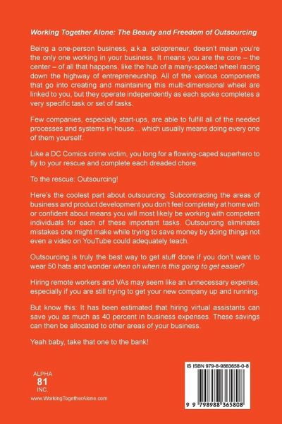 Imagine one year from now you're sitting in your own office running your own company and reading glowing reviews on the company you have just improved and leveraged thanks to the many benefits of outsourcing. After feeling great pride and satisfaction in what you've accomplished, you turn your attention to - not analyzing numbers in an Excel spreadsheet or a Quickbooks report - but a colorful page you found on the Internet with the heading: "Bike riding through Tuscany: the ultimate Italian vacation." Or some other dream adventure you've been hatching for over a decade. And as you envision the look on your friends' faces, or your partner's or spouse's, or the wide grins on the beaming faces of your kids - you try to decide how to best surprise them with the idea of special time just with them and the opportunity to create yet another spectacular memory. All of this is possible because you had the guts to learn how to work together alone: You've put into action the ability to leverage and implement outsourcing. You've created more than cash flow, profits, and an efficient organization. You've created time, and most importantly - freedom! Yes, dreams can come true. Now get after it and make yours happen!