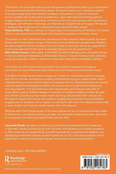 'This book is an invaluable resource to therapeutic practitioners wanting to understand more about working with domestic abuse. The book draws on an impressive wealth of practice experience and research evidence. Grounded in a trauma-informed, person-centred and relationship-focused lens, Jeannette and contributing authors engage deeply with the complexity of working with this client group, offering practical strategies, self-reflection exercises, and theoretical insights that will support therapists to develop their practice and understand more about domestic abuse.'