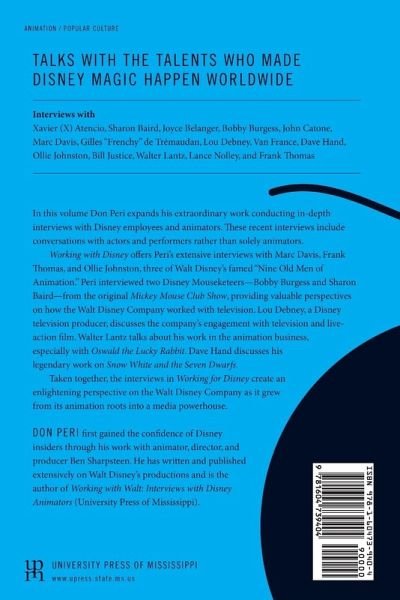 In this volume Don Peri expands his extraordinary work conducting in-depth interviews with Disney employees and animators. These interviews include conversations with actors and performers rather than solely animators. This book offers Peri's extensive interviews with Marc Davis, Frank Thomas, and Ollie Johnston, three of Walt Disney's famed "Nine Old Men of Animation." Peri interviewed two Disney Mouseketeers--Bobby Burgess and Sharon Baird--from the original Mickey Mouse Club Show, providing valuable perspectives on how the Walt Disney Company worked with television. Lou Debney, a Disney television producer, discusses the company's engagement with television and live-action film. Walter Lantz talks about his work in the animation business, especially with Oswald the Lucky Rabbit. And Dave Hand discusses his legendary work on Snow White and the Seven Dwarfs. Taken together, the interviews in Working with Disney create an enlightening perspective on the Walt Disney Company as it grew from its animation roots into a media powerhouse.