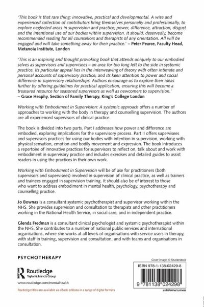 Working with Embodiment in Supervision will be of use for practitioners (both supervisors and supervisees) involved in supervision of clinical practice, as well as trainers and trainees engaged in supervision training. It should also be of interest to those who want to address embodiment in mental health, psychology, psychotherapy and counselling practice.