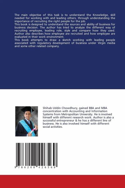 The main objective of this task is to understand the Knowledge, skill needed for working with and leading others, through understanding the importance of recruiting the right people for the job.This book is designed to understand the sources and ability of business for business decision. The author has tried to analyze the different way of recruiting employee, leading role, style and compare how they used. Author also describes how employee are recruited and how employee are evaluated in their work environment. This book attempts to draw a sketch working with leading people associated with regulatory development of business under Virgin media and some other related company.
