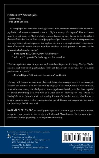 Working with Trauma: Lessons from Bion and Lacan by Marilyn Charles takes concepts from the psychoanalytic literature and translates them into user-friendly language. In this book, Charles focuses on clinical work with more severely disturbed patients, for whom trauma has impeded their psychosocial development. Introducing ideas from Bion and Lacan, such as "empty speech" and "attacks on linking," she shows the reader their clinical utility. Her use of clinical moments, rather than more lengthy vignettes, invites readers to recognize that type of dilemma and imagine how they might use the concept in their own work.