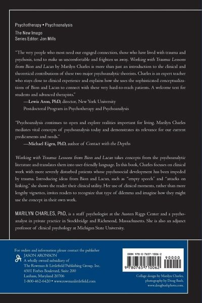 Working with Trauma: Lessons from Bion and Lacan by Marilyn Charles takes concepts from the psychoanalytic literature and translates them into user-friendly language. In this book, Charles focuses on clinical work with more severely disturbed patients, for whom trauma has impeded their psychosocial development. Introducing ideas from Bion and Lacan, such as "empty speech" and "attacks on linking," she shows the reader their clinical utility. Her use of clinical moments, rather than more lengthy vignettes, invites readers to recognize that type of dilemma and imagine how they might use the concept in their own work.