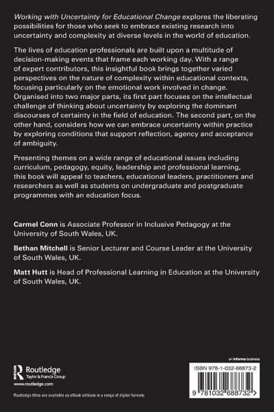 The lives of education professionals are built upon a multitude of decision-making events that frame each working day. With a range of expert contributors, this insightful book brings together varied perspectives on the nature of complexity within educational contexts, focusing particularly on the emotional work involved in change. Organised into two major parts, its first part focuses on the intellectual challenge of thinking about uncertainty by exploring the dominant discourses of certainty in the field of education. The second part, on the other hand, considers how we can embrace uncertainty within practice by exploring conditions that support reflection, agency and acceptance of ambiguity.