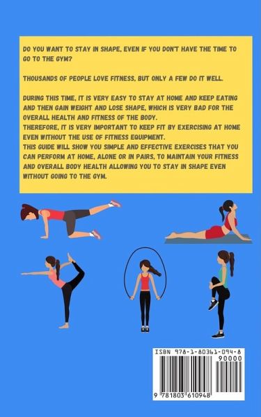Do you want to stay in shape, even if you don't have the time to go to the gym? Thousands of people love fitness, but only a few do it well. During this time, it is very easy to stay at home and keep eating and then gain weight and lose shape, which is very bad for the overall health and fitness of the body. Therefore, it is very important to keep fit by exercising at home even without the use of fitness equipment. This guide will show you simple and effective exercises that you can perform at home, alone or in pairs, to maintain your fitness and overall body health allowing you to stay in shape even without going to the gym. ¿¿Buy it Now and keep fit even if you can't go to the gym!