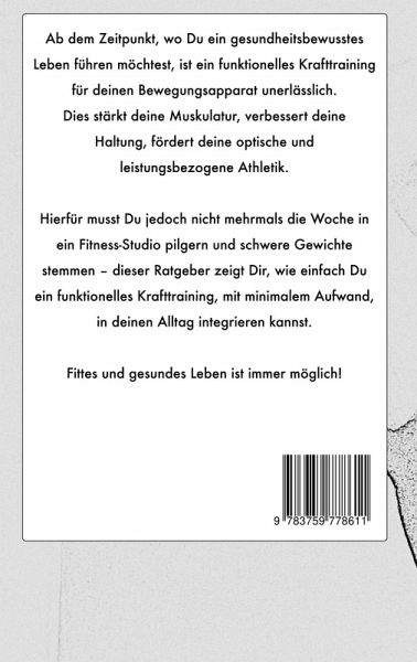 Ab dem Zeitpunkt, wo Du ein gesundheitsbewusstes Leben führen möchtest, ist ein funktionelles Krafttraining für deinen Bewegungsapparat unerlässlich. Dies stärkt deine Muskulatur, verbessert deine Haltung und fördert deine optische und leistungsbezogene Athletik. Hierfür musst Du jedoch nicht mehrmals die Woche in ein Fitness-Studio pilgern und schwere Gewichte stemmen. Dieser Ratgeber zeigt Dir, wie einfach Du ein funktionelles Krafttraining, mit minimalem Aufwand, in deinen Alltag integrieren kannst. Fittes und gesundes Leben ist immer möglich! Weiter werden, in diesem Buch, Themen wie funktionelle Ernährung, Körperbautypen und allgemein gesundheitsförderliche Bewegung besprochen. All dies auf pragmatische und leicht umsetzbare Art und Weise.