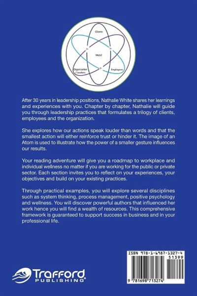 After 30 years as a public servant and over 20 years of those years in leadership positions, Nathalie White shares her learnings and experiences with you. Chapter by chapter, Nathalie will guide you through leadership practices that formulates a trilogy of clients, employees and the organization. She explores how our actions speak louder than words and that the smallest action will either reinforce trust or hinders it. The image of an Atom is used to illustrate the power of a smaller gesture influences our results. Your reading adventure will give you a roadmap to workplace and individual wellness not matter if you are working the public or private sector. Each sections invites you to reflect on your experiences, your objectives and build on your existing practices. Through practical exercises, you will navigate with several disciplines such as the system thinking, process management, positive psychology and wellness. You will discover several powerful authors that influenced her work hence you will find a wealth of resources. This comprehensive framework is guarantee to show success in business and in your professional life.