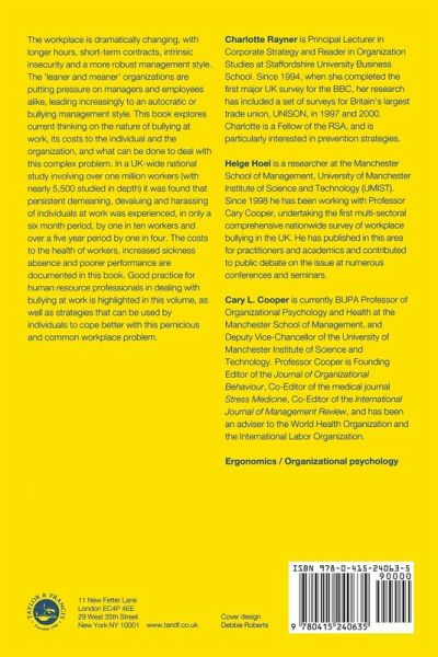 Workplace bullying is an area that has attracted significant press attention throughout the last decade. At a conservative estimate, over half the working population can expect to experience bullying at work at some stage in their careers, either directly by being bullied or through witnessing it, and 20 percent of witnesses and 25 percent of direct targets will leave their organizations. Workplace Bullying is derived from the largest survey ever carried out on workplace bullying, supported by the CBI, TUC, Federation of Small Businesses, IPD, and the HSE among others. The book goes beyond the study to explore all the issues associated with what is becoming a major issue in organizations.