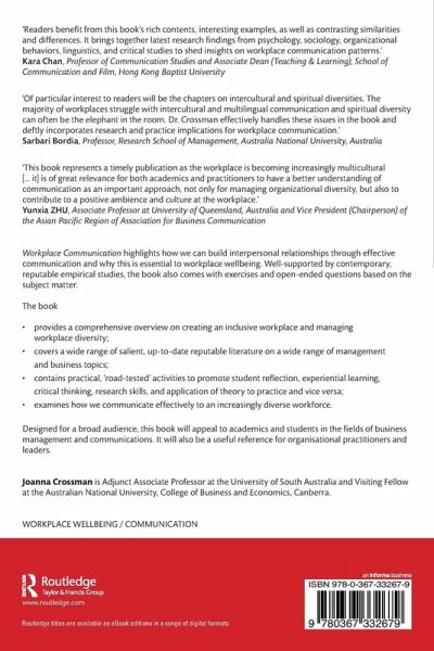 'Workplace Communication by Joanna Crossman is written in a well-organized manner: readers benefit from its rich contents, interesting examples, as well as contrasting similarities and differences. It brings together latest research findings from psychology, sociology, organizational behaviors, linguistics, and critical studies to shed insights on workplace communication patterns. It can be used as a text for upper class undergraduate program or master program of human resources management, communication, as well as organizational psychology.'