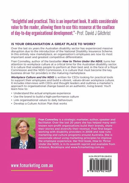 IS YOUR ORGANISATION A GREAT PLACE TO WORK? Over the last six years the Australian disability sector has experienced massive disruption due to the introduction of the National Disability Insurance Scheme. In this entirely new marketplace, an organisation's employees are now its most important asset and greatest competitive differentiator. Fran Connelley, author of the bestseller How to Thrive Under the NDIS, turns her attention to workplace culture at a critical time for the Australian disability sector. It is culture that enables people to perform at their best and, in the face of a Royal Commission and the NDIS Commission, it is culture that must become the key business driver for providers in the maturing marketplace. Workplace Culture and the NDIS is written for CEOs looking for practical tools to support their employees and build a vibrant, values-driven workplace culture. It includes interviews with CEOs and thought leaders and outlines a marketer's approach to organisational change based on an authentic, living brand. You'll learn how to:Understand the actual employee experience Use the brand to build a high-performance culture Link organisational values to daily behaviours Develop a Culture Action Plan that works