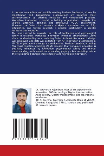In today's competitive and rapidly evolving business landscape, driven by globalization and digitalization, organizations are becoming more customer-centric by offering innovative and value-added products. Workplace innovation is crucial in helping organizations navigate the volatile, uncertain, complex, and ambiguous (VUCA) environment. However, the factors that enhance workplace innovation are not fully established, and further research is needed, particularly in specific industries and countries.This study aimed to evaluate the role of facilitation and psychological safety in fostering workplace innovation within IT organizations, using shared understanding as a mediating factor. A descriptive research design was employed, and data was collected from 431 innovation practitioners in IT/ITES organizations through a questionnaire. Statistical analysis, including Structural Equation Modelling (SEM), revealed that workplace innovation is positively influenced by facilitation, psychological safety, and shared understanding, with shared understanding playing a key mediating role in the relationship between these enablers and workplace innovation.