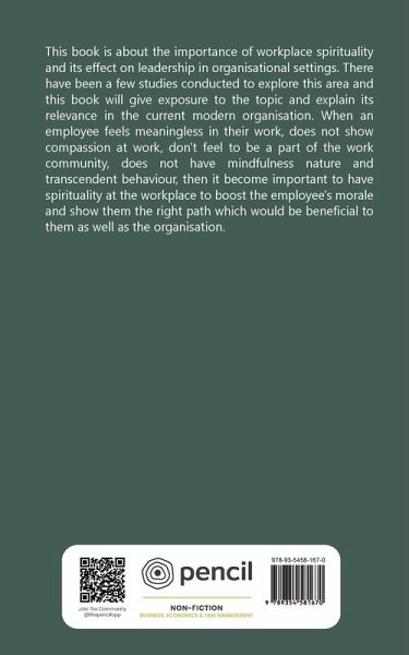 This book is about the importance of workplace spirituality and its effect on leadership in organisational settings. There have been a few studies conducted to explore this area and this book will give exposure to the topic and explain its relevance in the current modern organisation. When an employee feels meaningless in their work, does not show compassion at work, don't feel to be a part of the work community, does not have mindfulness nature and transcendent behaviour, then it become important to have spirituality at the workplace to boost the employee's morale and show them the right path which would be beneficial to them as well as the organisation.