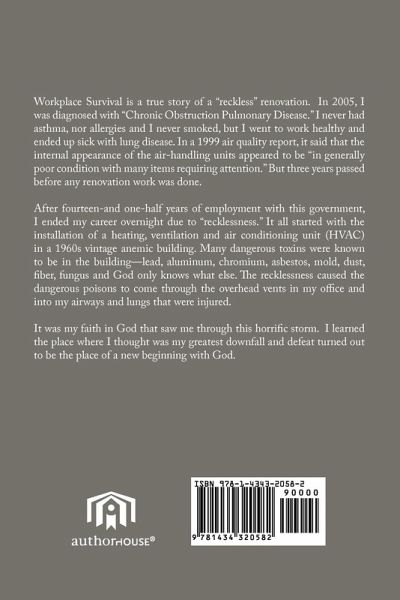 Workplace Survival is a true story of a "reckless" renovation. In 2005, I was diagnosed with "Chronic Obstruction Pulmonary Disease." I never had asthma, nor allergies and I never smoked, but I went to work healthy and ended up sick with lung disease. In a 1999 air quality report, it said that the internal appearance of the air-handling units appeared to be "in generally poor condition with many items requiring attention." But three years passed before any renovation work was done. After fourteen-and one-half years of employment with this government, I ended my career overnight due to "recklessness." It all started with the installation of a heating, ventilation and air conditioning unit (HVAC) in a 1960s vintage anemic building. Many dangerous toxins were known to be in the building-lead, aluminum, chromium, asbestos, mold, dust, fiber, fungus and God only knows what else. The recklessness caused the dangerous poisons to come through the overhead vents in my office and into my airways and lungs that were injured. It was my faith in God that saw me through this horrific storm. I learned the place where I thought was my greatest downfall and defeat turned out to be the place of a new beginning with God.