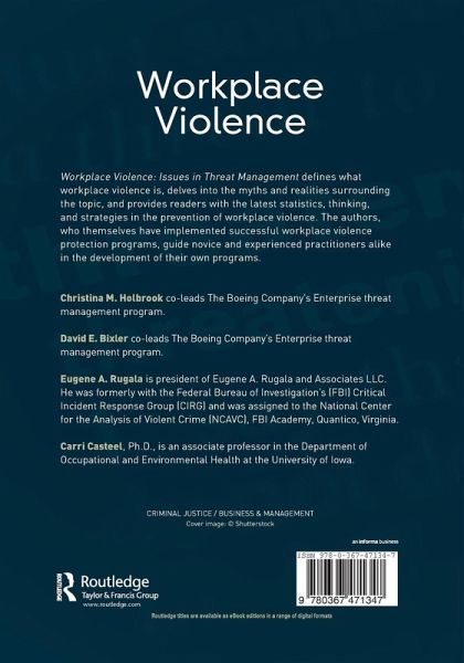Christina M. Holbrook co-leads The Boeing Company's Enterprise threat management program. David E. Bixler co-leads The Boeing Company's Enterprise threat management program. Eugene A. Rugala is president of Eugene A. Rugala and Associates LLC. He was formerly with the Federal Bureau of Investigation's (FBI) Critical Incident Response Group (CIRG) and was assigned to the National Center for the Analysis of Violent Crime (NCAVC), FBI Academy, Quantico, Virginia. Carri Casteel, MPH, Ph.D., is an associate professor in the Department of Occupational and Environmental Health at the University of Iowa.
