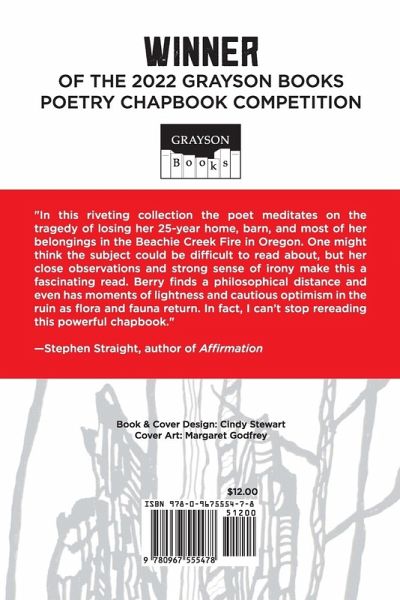Works of Wildfire won the 2022 Grayson Books Chapbook Contest. Poet Eleanor Berry survived the Beachie Creek Fire in Oregon, but lost her home and most of her belongings as a result of the fire. The riveting poems in this collection reenact that event, and then reflect on it.