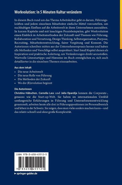 Das Buch Workvolution: In 5 Minuten Kultur verändern gibt Tipps und Tricks rund um das Thema Arbeitskultur. Ohne wissenschaftlichen Anspruch, einfach und kurz geschrieben. Konkret geht es darum, Führungskräften in 5 Minuten einfache Mittel vorzustellen, nachhaltigen Einfluss auf die Arbeitswelt in ihren Unternehmen zu nehmen. In kurzen Abschnitten werden die neue Arbeitswelt, die neue Rolle von Führung und Methoden der Zukunft vorgestellt, um dann konkrete Beispiele zu geben, was das nun für Unternehmen bedeutet und wie man das erreichen kann. Das Buch ist keine wissenschaftliche Abhandlung. Die Autorinnen geben ihre Sicht der Dinge wieder. Sie haben vieles erlebt, noch mehr gesehen, vieles ausprobiert. Würden sie ihre eigene Firma gründen, würden sie all das Geschriebene anwenden wollen. Denn sie glauben: Vieles sollte heutzutage anders gemacht werden und eigentlich wäre es gar nicht so schwer, den Anfang zu wagen. Das Buch bietet kurze und knappe Kapitel. Der Leser kann in 5 Minuten mehr zu bestimmten Themen erfahren und sich durch die Quellenverweise im Buch detaillierter in einzelne Themen einfinden wie User Experience, Design Thinking, Selbstorganisation, Purpose, Recruiting, Mitarbeiterentwicklung, faire Vergütung, Konsent und vieles mehr. Mit Start Small Kapiteln als Inspiration und praktische Anleitung, um Veränderungen anzustoßen.