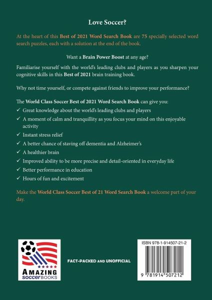 Love Soccer? At the heart of this Best of 2021 Word Search Book are 75 specially selected word search puzzles, each with a solution at the end of the book. Want a Brain Power at any age? Familiarise yourself with the world's leading clubs and players as you sharpen your cognitive skills in this Best of 2021 brain training book. Why not time yourself, or compete against friends to improve your performance? The World Class Soccer Best of 2021 Word Search Book can give you ¿ Great knowledge about the world's leading clubs and players ¿ A moment of calm and tranquillity as you focus your mind on this enjoyable activity ¿ Instant stress relief¿ A better chance of staving off dementia and Alzheimer's ¿ A healthier brain ¿ Improved ability to be more precise and detail-oriented in everyday life ¿ Better performance in education ¿ Hours of fun and excitement ¿Make the World Class Soccer Best of 2021 Word Search Book a welcome part of your day.