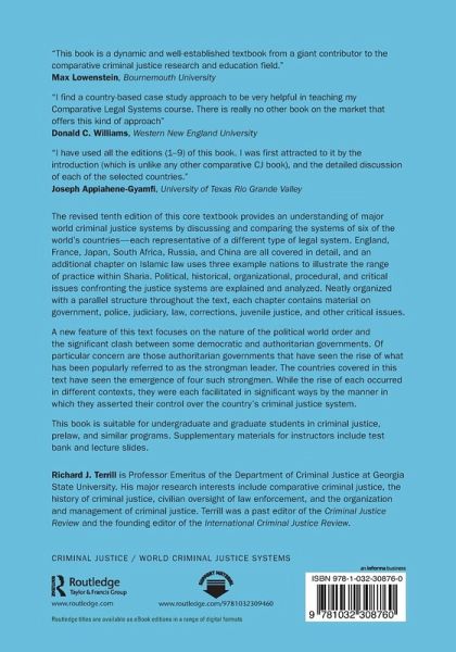 The revised tenth edition of this core textbook provides an understanding of major world criminal justice systems by discussing and comparing the systems of six of the world's countries - each representative of a different type of legal system. England, France, Japan, South Africa, Russia, and China are all covered in detail, and an additional chapter on Islamic law uses three example nations to illustrate the range of practice within Sharia. Political, historical, organizational, procedural, and critical issues confronting the justice systems are explained and analyzed. Neatly organized with a parallel structure throughout the text, each chapter contains material on government, police, judiciary, law, corrections, juvenile justice, and other critical issues.