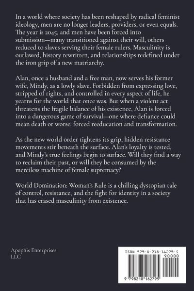 Woman have conquered the world! In this story of mine, the world is in a new world where men are slaves to women and suppressed by the female anarchy. You will follow Alan, as he tells his story of how the world has changed and the way men were treated in this new world. Little does he know of the rebel group until the right moment.