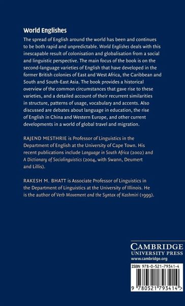 The spread of English around the world has been and continues to be both rapid and unpredictable. World Englishes: The Study of New Linguistic Varieties deals with this inescapable result of colonisation and globalisation from a social and linguistic perspective. The main focus of the book is on the second-language varieties of English that have developed in the former British colonies of East and West Africa, the Caribbean, South and South-East Asia. The book provides a historical overview of the common circumstances that gave rise to these varieties, and a detailed account of their recurrent similarities in structure, patterns of usage, vocabulary and accents. Also discussed are debates about language in education, the rise of English in China and Western Europe, and other current developments in a world of global travel and migration.