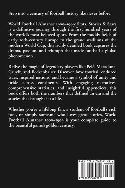 Step into a century of football history like never before. World Football Almanac 1900-1999: Stats, Stories & Stars is a definitive journey through the first hundred years of the world's most beloved sport. From the muddy fields of early 20th-century Europe to the grand stadiums of the modern World Cup, this richly detailed book captures the drama, passion, and triumph that made football a global phenomenon. Relive the magic of legendary players like Pelé, Maradona, Cruyff, and Beckenbauer. Discover how football endured wars, inspired nations, and became a symbol of unity and pride across continents. With engaging narratives, comprehensive statistics, and insightful appendices, this book offers both the numbers that defined an era and the stories that brought it to life. Whether you're a lifelong fan, a student of football's rich past, or simply someone who loves great stories, World Football Almanac 1900-1999 is your complete guide to the beautiful game's golden century.