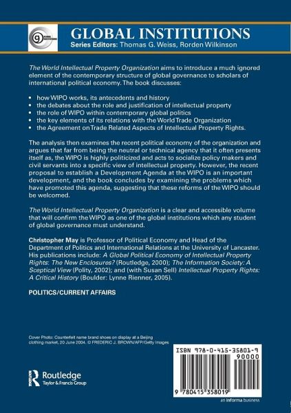Covering the World Intellectual Property Organization, this volume introduces a much ignored element of the contemporary structure of global governance to scholars of international political economy. Christopher May discusses: how the World Intellectual Property Organization works, its antecedents and history the debates about the role and justification of intellectual property the role of WIPO within contemporary global politics the key elements of its relations with the World Trade Organization the Agreement on Trade Related Aspects of Intellectual Property Rights. The analysis then examines the recent political economy of the organization and argues that far from being the neutral or technical agency that it often presents itself as, the WIPO is highly politicized and acts to socialize policy makers and civil servants into a specific view of intellectual property. However, the recent proposal to establish a Development Agenda at the WIPO is an important development, and the book concludes by examining the problems which have promoted this agenda, suggesting that these reforms of the WIPO should be welcomed. The World Intellectual Property Organization is a clear and accessible volume that will confirm the WIPO as one of the global institutions which any student of global governance must understand.