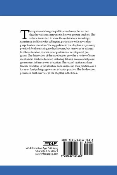 A volume in Contemporary Language Education Series Editor: Terry A. Osborn, Fordham University The significant change in public schools over the last two decades warrants a response in how we prepare teachers. This volume is an effort to share the contributors' knowledge, experience and ideas with colleagues, particularly with novice language teacher educators. The suggestions in the chapters are primarily provided for the teaching methods course, but many can be adapted to other education courses or for professional development programs. The first section of the introduction provides a review of issues identified in teacher education including debates, accountability, and government influence over education. The second section explores teacher educators in the literature such as issues in their practice, and a focus on foreign language teacher educator practice. The third section provides a brief overview of the chapters in the book