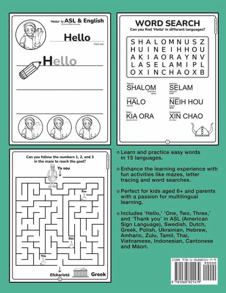 Discover a world of linguistic adventure with "World Languages for Kids 2"! This delightful sequel is perfect for young readers eager to explore the vibrant sounds and cultures of 15 additional languages. Nurture your child's curiosity with playful introductions to new phrases and greetings in American Sign Language (ASL), Swedish, Dutch, Greek, Polish, Ukrainian, Hebrew, Amharic, Zulu, Tamil, Thai, Vietnamese, Indonesian, Cantonese, and M¿ori. Each page is filled with simple and common phrases like "Hello," "Goodbye," and "Thank you," all presented in a fun and easy-to-understand way. The book features vivid and colorful illustrations that captivate young readers and enhance their learning experience. By engaging with different cultures and languages, your child will develop global awareness and foster multicultural friendships. Phonetic pronunciations make reading and pronunciation easier, turning language learning into an enjoyable adventure. Embark on this enchanting journey and unlock the door to a world of languages and cultures. This book is an ideal gift for birthdays, holidays, or any special occasion, providing a thoughtful and educational experience that keeps on giving. This book is part of the award-winning World Languages for Kids series, which includes a Picture Book, Coloring Book, Activity Book, Notebook, and Drawing Book - all available in two volumes, each featuring different languages.